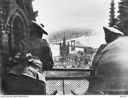 Rhein in Köln. Dabei wird ausgiebig das Kölner Rheinpanorama gezeigt. Im zweiten Teil des Films werden schwere Geschütze gezeigt, die mit Zugmaschinen durch Köln gezogen werden. Da die Alliierten Anfang Dezember nach Köln kamen, war es also Winter. Daher kann man im dritten Teil des Videos neuseeländische Soldaten sehen, die einen kleinen Wald abholzen um Brennholz für den Winter zu haben. Die nachfolgenden Szenen zeigen einen Wachwechsel sowie eine kleine Truppenparade vor einer Ansammlung von Geschützen. Ab timecode 6:24 wird eine zerstörte Stadt sowie gezeigt ein Landstrich. Es wird auch eine Stadtbefestigung mit Stadttor sowie eine andere (?) zerstörte Stadt gezeigt. Diese Filmaufnahmen wurden nicht in Köln gedreht. |