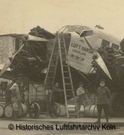 evtl. nachgefüllt. Der typische Lufthansaanstrich der damaligen Zeit hatte je einen sehr breiten schwarze Streifen über die Tragfläche hinter dem jeweiligen Motor. Dies hatte den Hintergrund, dass man die schwarzen Ölstreifen auf den silbernen Außenhaut nicht so deutlich sehen konnte. Mit der Entwicklung der Flugzeuge war auch eine Zunahme von Motoren in Bezug auf Anzahl und Leistung verbunden. Somit stieg auch der Ölverbrauch. Wie man auf diesem Foto des Butzweilerhofs von 1936 sehen kann, wurde auch Schmierwagen mit größerem Vorratstank gebraucht. Bild