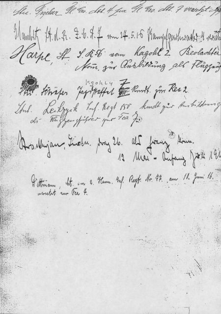 Fl.Ers.Abt.7 versetzt April 1916 Haubitz? Lt.d.R. F.E.A.7 vom 27.5.16 Kampfgeschwader 4 versetzt Harpe Lt. I.R.56 vom Kagohl 2 Beobachter koiii.zur Ausbildung als Flugzeugführer Kgohl 4 Ltn.Schäfer Jagdstaffel 7 kmdr.zur Rea 2 Ltnt.Leik..ik? Inf.Regt.150 kmdt zur Ausbildung als Flugzeugführer zur Fea 7. Strackejan, Leutn. Drag.26. als Franz kom. 12.Mai - Anfang Juli 1916 Dittmann Lt.im 2.Hann.Inf.Regt.Nr.77. am 10.Juni 16 versetzt zur Fea 7. *) Kagohl = Kampfgeschwader Oberste Heeresleitung **) Rea = Riesenflugzeug-Ersatz-Abteilung ***) Franz = Beobachter #) siehe auch auf Blatt 26 |
