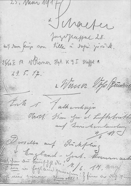 Schaefer Jagdstaffel 28 Auf dem Fluge von Lille u.dahin zurück. 25/26 V 17. 29. 5. 17. Fritz v.Körner Hpt. K G I. Staffellit. Werner Voß (Brüderchen) 1315 v. Falkenhayn Oberlt. Kom.Gen.d.Luftstreitkräfte 4/6 17 Derselbe auf Rückflug J7 England - Gent -Kreuznach. 7./6.17. aaah **) Fritzchen Du täuschst Dir ! **) Bist nie in England gewesen ! Hast nur immer gewollt ! Einer der Dich kennt ! *) siehe auch auf Blatt 7 (?) **) Zusatzeintragungen anderer
