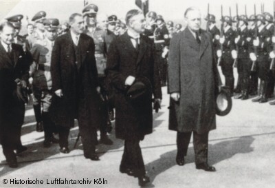 Adolf Hitler Reichskanzler Adolf Hitler trifft am 17. März 1933 abends kurz vor 23 Uhr, von Dortmund kommend, auf dem Flughafen Köln Butzweilerhof ein, wo ihn eine Abteilung der Kölner SS erwartet. Zu seinem Empfang sind Gauleiter Josef Grohé und Standartenführer Zenner erschienen. Im Namen der Stadt Köln und des Oberbürgermeisters Dr. Konrad Adenauer (er brüskiert Hitler durch seine Abwesenheit) begrüßt Beigeordneter Dr. Heinrich Billstein den Reichskanzler, der ihn jedoch ignoriert, um voll Zorn nach Godesberg in das Hotel Dreesen zu fahren. Am 18. März flog Hitler vom Butzweilerhof aus weiter nach München. Am 19. März traf Hitler wieder, aus München kommend, auf dem Butzweilerhof ein. 26. August 1934 Anläßlich der Saarausstellung landet Reichskanzler Adolf Hitler auf dem Flughafen Köln Butzweilerhof. Zusammen mit Joseph Goebbels eröffnet er in den Messehallen die Propagandaschau „Die Saar“. |