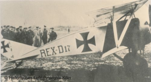 gebaut. Die Kölner Flugzeugbaufirma Rex in der Frohnhofstraße in Ossendorf stelle bereits sehr früh Flugzeuge her. Für Werner Voß wurde 1917 die hier rechts abgebildete "Rex-D17" gebaut. Angeblich soll Voß an der Entwicklung mitgearbeitet haben. ![]() Werner Voß flog in seiner Dienstzeit an der Front zwei Flugzeuge: (Links) Seine erste Maschine war eine gelbe Albatros D.III, die an der Seite mit einem Hakenkreuz, das von einem Lorbeerkranz umgeben war, bemalt war. Davor war ein rotes Herz aufgemalt. Anmerkung: Bei diesem Hakenkreuz handelt es sich nicht um ein Hakenkreuz im nationalsozialistischen Sinn. Das von Werner Voß hatte eine etwas andere Form und Lage als das nationalsozialistische Hakenkreuz. Dieses Hakenkreuz von Werner Voß ist als griechisches Siegessymbol zu werten. Unten: ein Foto dieser Maschine vor dem südlichen Ende der Halle 2 der Fliegerstation Butzweilerhof. Wahrscheinlich wurde das Foto am Dienstag den 29. Mai 1917 gemacht, als Werner Voß den Butzweilerhof besuchte. Damals trug er sich auch in das Gästebuch der Fliegerstation ein. ![]() Seine letzte Maschine war eine Fokker DR.1 mit einem auffälligen Gesicht auf der Motorhaube. Mit dieser Maschine trat er auch gegen sieben britische Maschinen vom Typ S.E.5a der britischen No. 56 Squadron an. Dieses