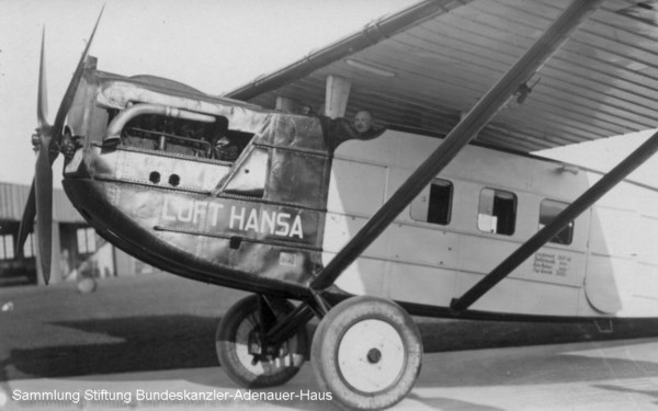 ![]() Der Oberbürgermeister der Stadt Köln, Konrad Adenauer, mit Familie zu Besuch auf dem Flughafen Köln Butzweilerhof. In seiner Position im Aufsichtsrat der neuen Luft Hansa bewies er großes Interesse an der neuen Luftfahrt. Hier mit seiner Frau Gussi, seinem Sohn Max Adenauer (dem späteren Oberstadtdirektor von Köln) sowie seiner Tochter Ria. |