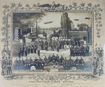 ![]() Bild rechts: Interessant sind auch die Regimentsbilder der verschiedennen Kölner Heereseinheiten. Obwohl die Heereseinheiten (hier die Artillerie) keine Verbindung zu den Luftschiffern haben, werden im Hintergrund, neben dem Kölner Rheinpanorama, sehr oft die Kölner Luftschiffe gezeigt. Die preussische Armee bzw. die Garnison Cöln war stolz auf die in Köln-Bickendorf stationierte moderne Flotte der Luftschiffe. Nach heutigen Maßstäben gehörten die Luftschiffe zu einer Luftwaffe. Allerdings wurde eine eigene Teilstreitkraft Luftwaffe erst am 1.März 1935 ernannt. Bis zu diesem Zeitpunkt gehörten die Luftschiffe zum Heer bzw. zur Marine. Heeresluftschiffe trugen die Bezeichnung (z.B.) Z II oder Z VI "Cöln". Marineluftschiffe die Bezeichnung LZ (Nummer). |