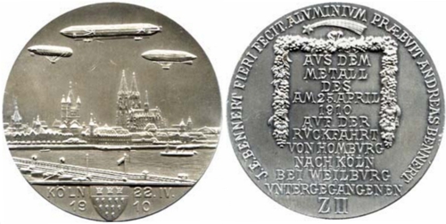 Aluminiumteile des Z II zu besorgen. Aus diesem Aluminium wurden 22 Medaillen geprägt, wie sie hier rechts abgebildete sind. Aufschrift: "Aus dem Metall des am 23. April auf der Rückfahrt von Homburg nach Köln bei Weilburg untergegangenen Z II." |